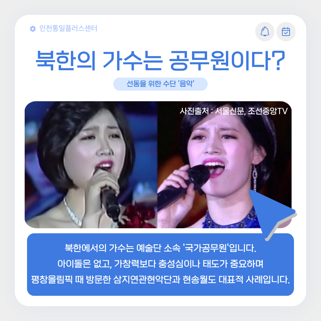 북한에서 가수는 예술단 소속의 "국가공무원"입니다.