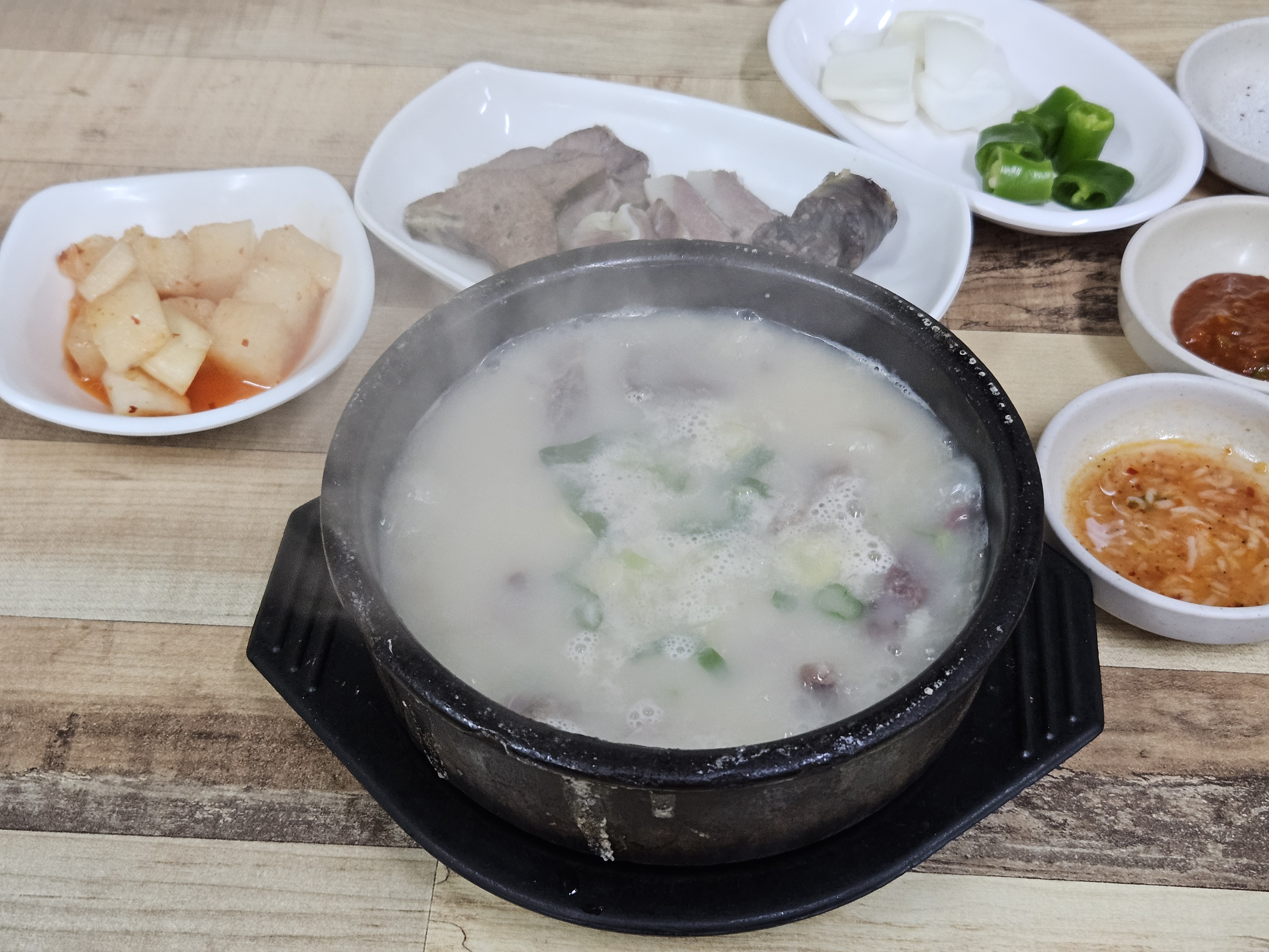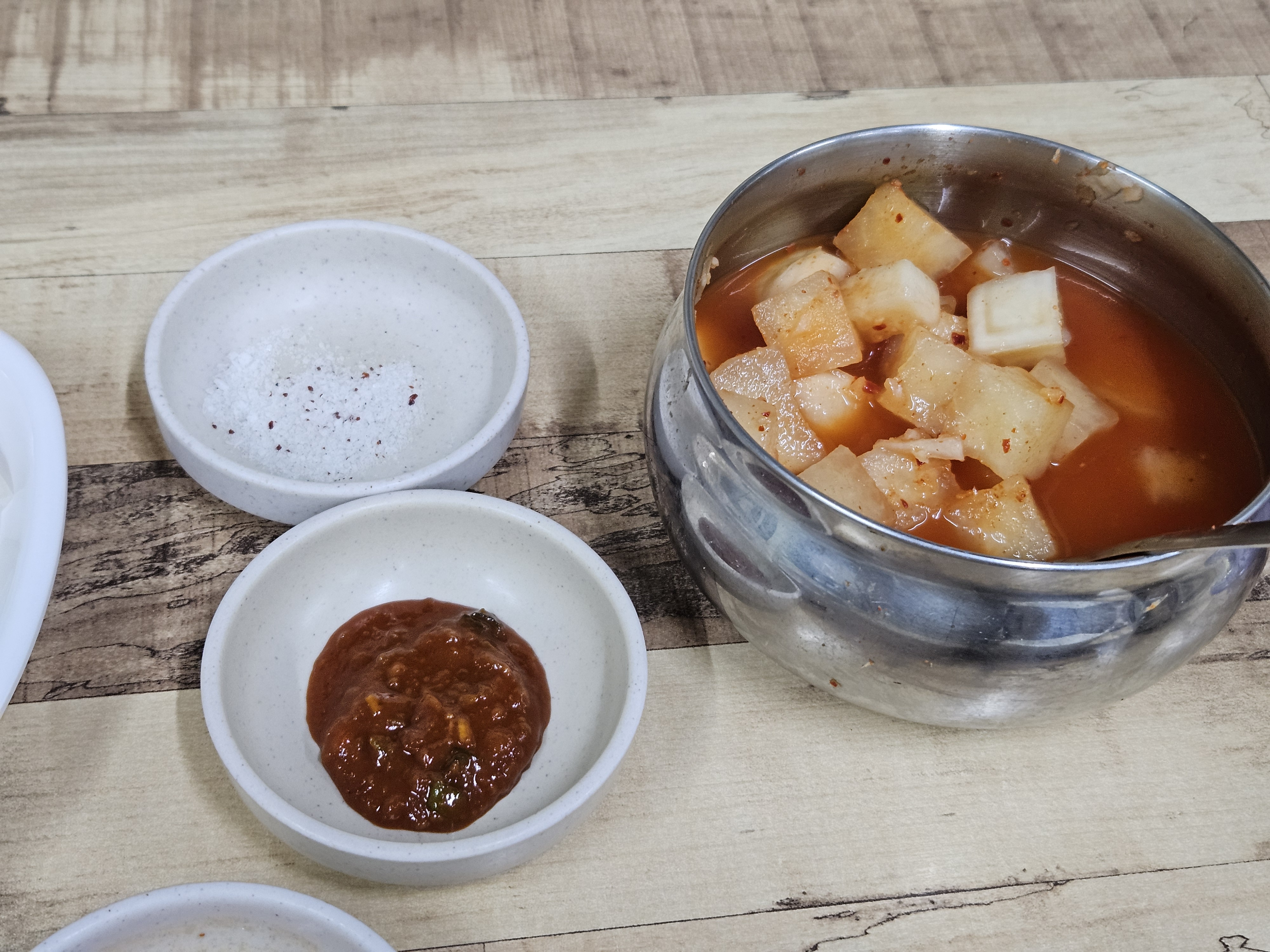 기본적으로 깍두기와 양파, 고추, 새우젓 등이