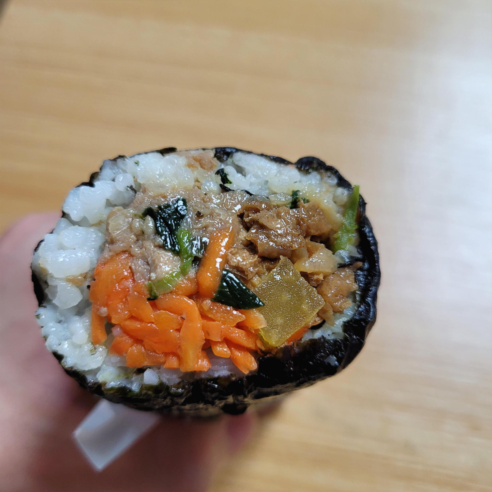 고기에서 은은하게 불맛이 나고, 불고기답게 달짝지근한 김밥입니다. 호불호가 갈리지 않을 맛이에요.