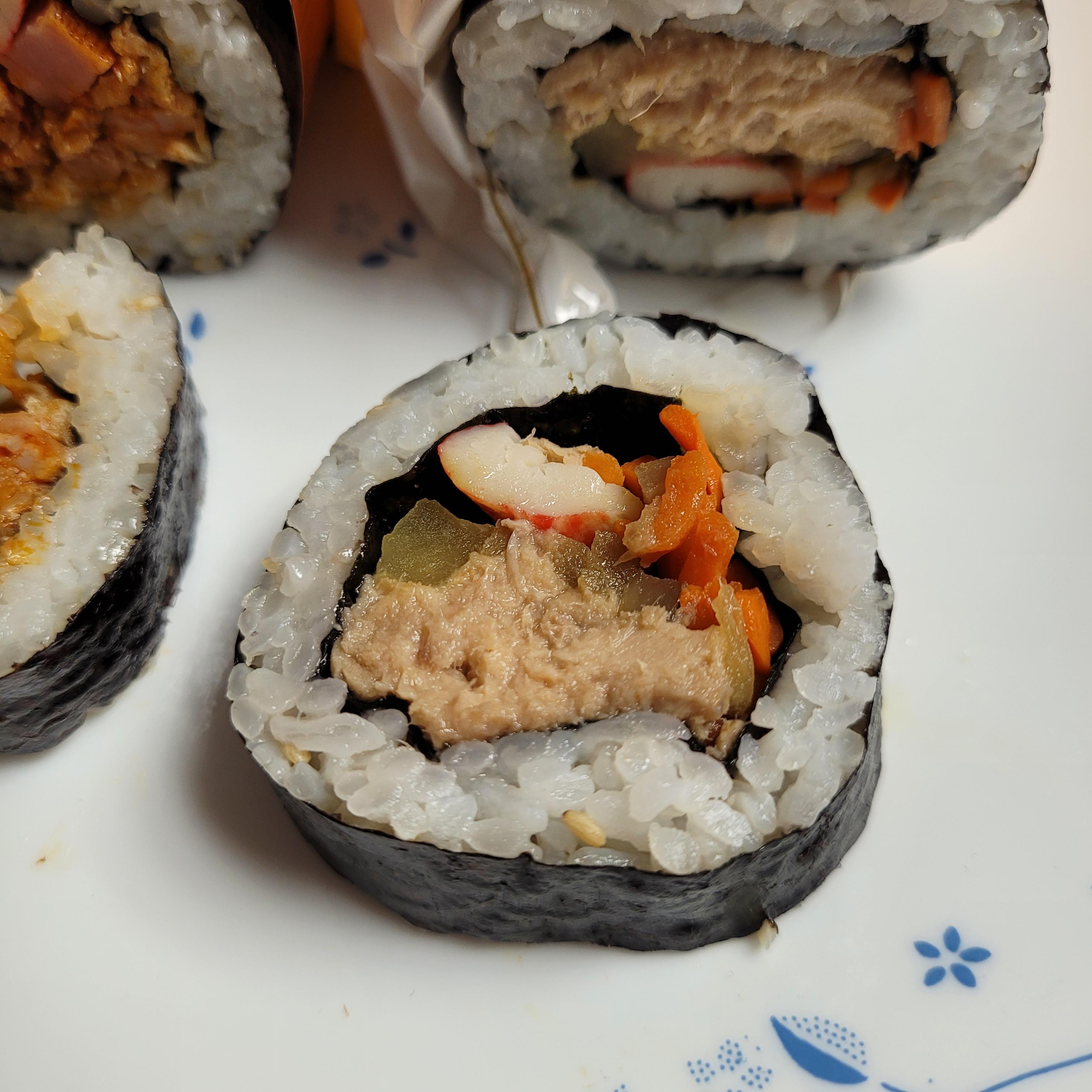 일반 참치김밥의 맛 상상하시면 될 듯 하고, 더 속이 꽉차있는 느낌이에요. 중간에 간장에 졸인 우엉과 유부가 감칠맛을 주는게 좋았습니다.