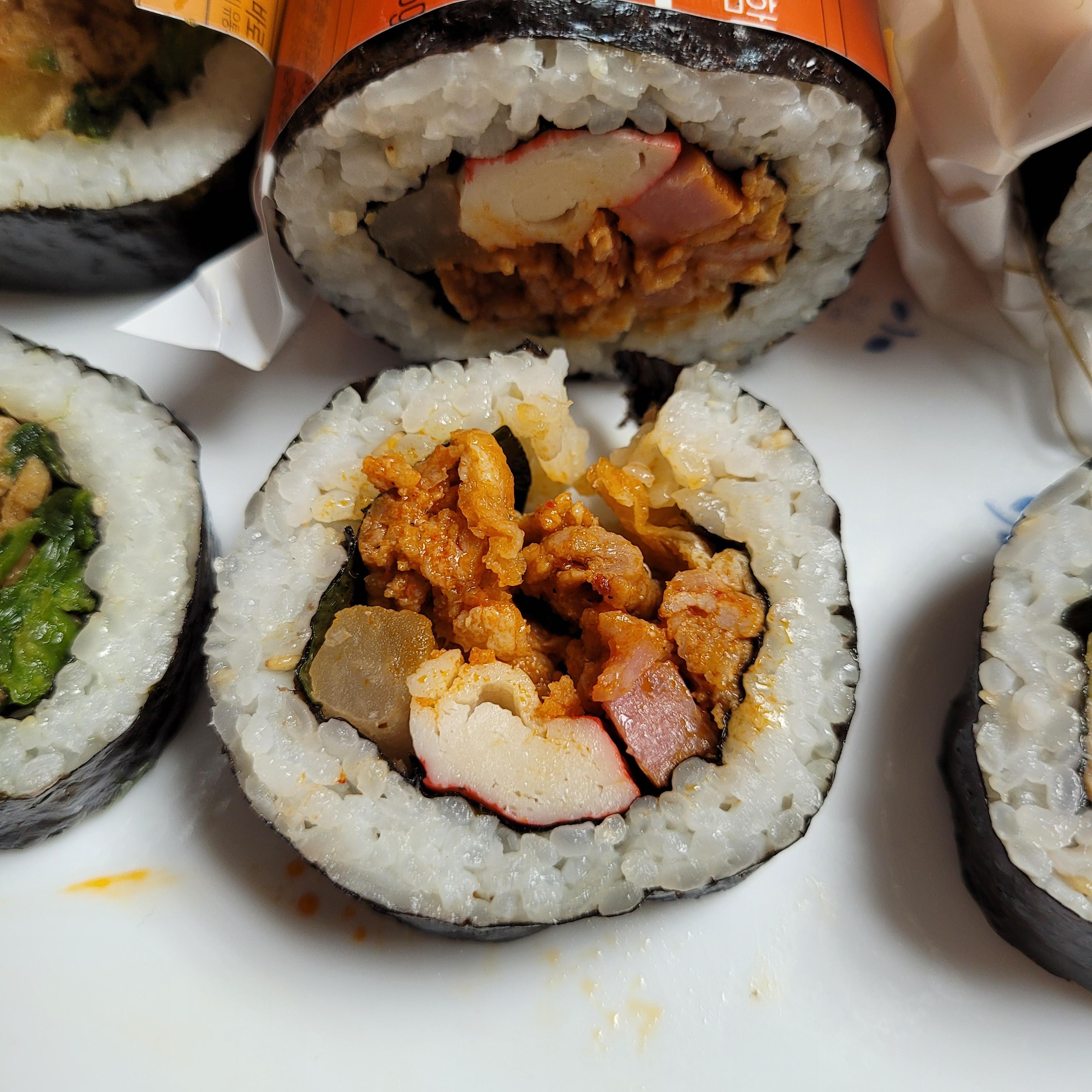 제육볶음이 생각보다 매콤해서, 매운걸 잘 못드시는 분들은 먹기가 힘들 수도 있다고 생각합니다. 개인적으로는 신제육볶음김밥이 매콤해서 제일 맛있는 것 같아요!