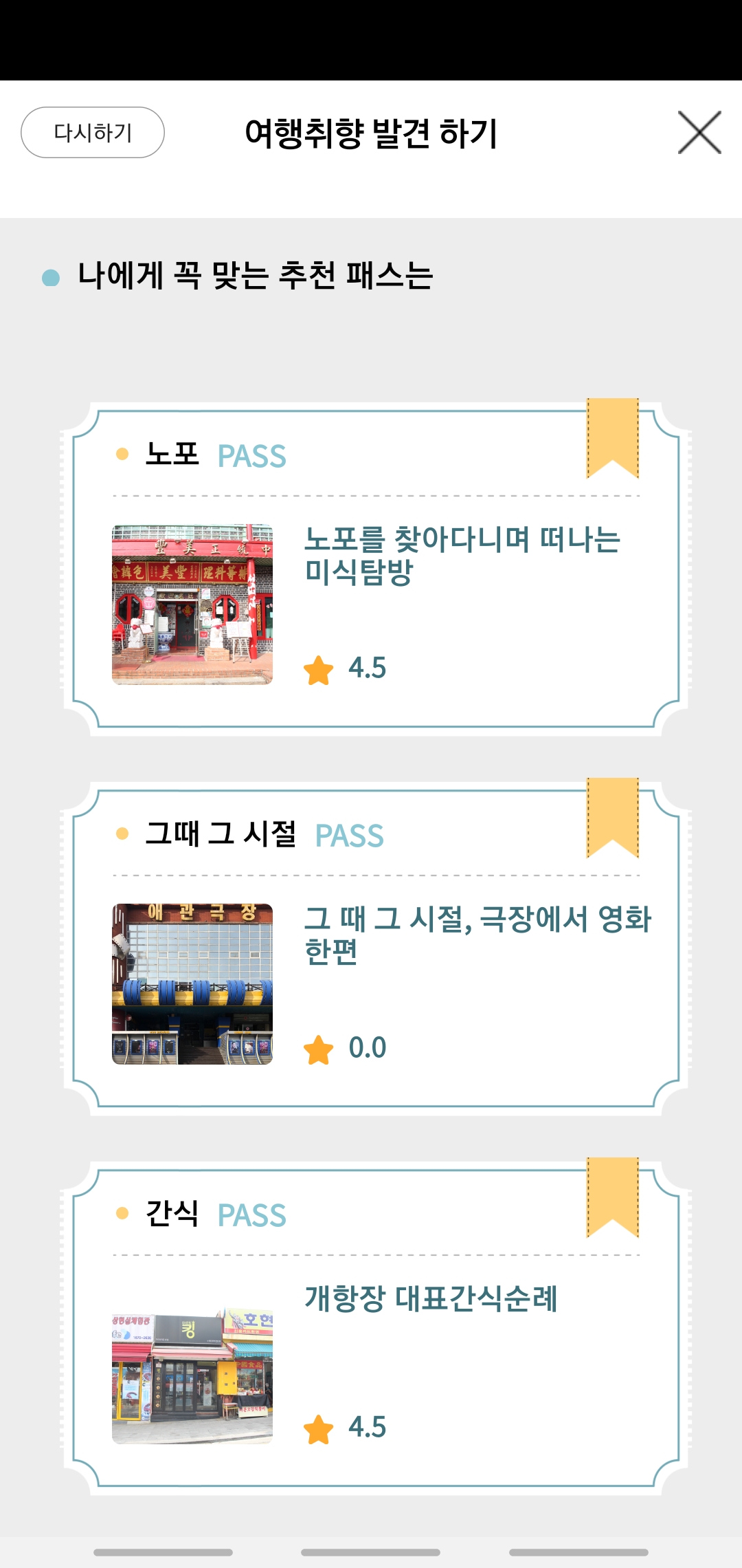 '노포를 찾아다니며 떠나는 미식 여행', '그때 그 시절, 극장에서 영화 한 편', '개항장 대표 간식 순례'의 코스를 추천받았습니다.