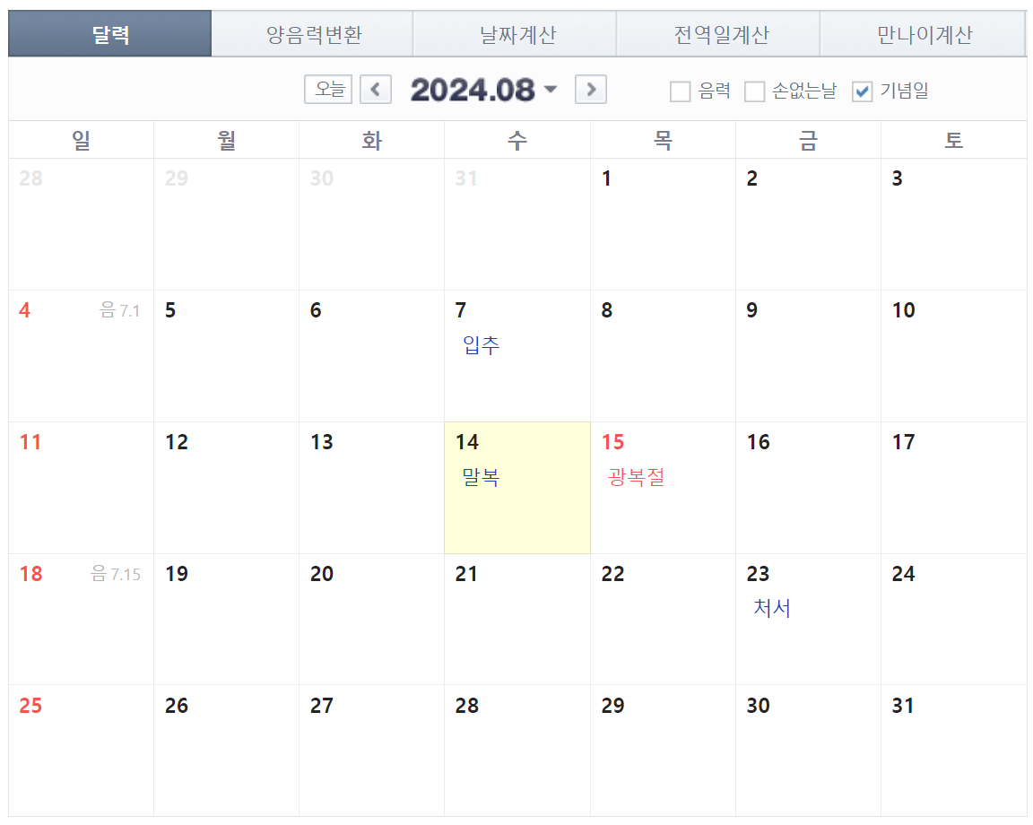 일반인들이 양력 달력에서는 계산하기는 번거롭기 때문에, 요즘에는 인터넷 검색창에서 검색하면 손쉽게 확인해 볼 수 있습니다.